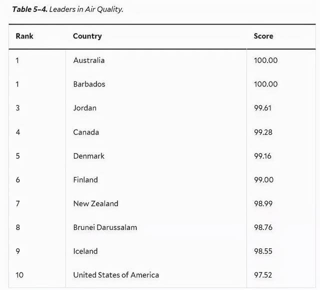 空气质量排名中是,前十名的国家还有:1、澳大利亚;2、巴巴多斯;3、约旦;4、加拿大;5、丹麦;6、芬兰;7、新西兰;8、文莱;9、冰岛;10、美国。