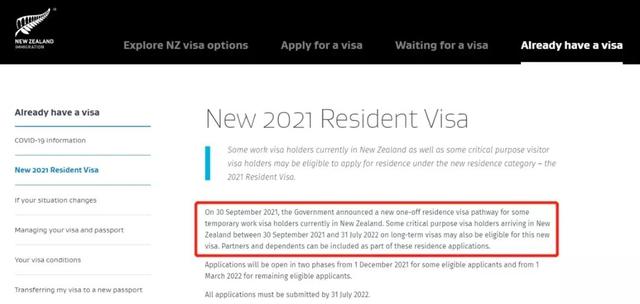 上月新西兰推出名为“New 2021 Resident Visa”的新签证,申请条件非常简单,只要在2021年9月29日申请人在新西兰或澳洲境内,并且符合新签证的申请要求,就可以一步到位获得新西兰永居,预计将有16.5万申请人从中获益。