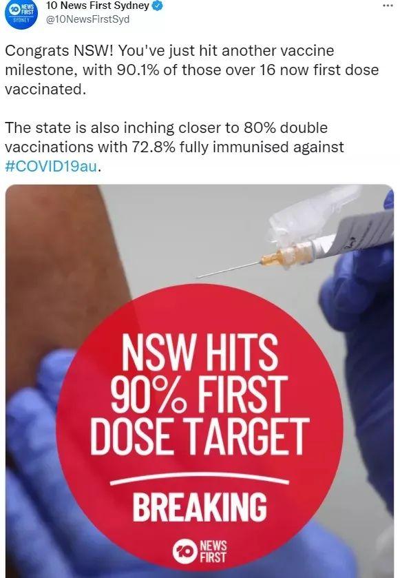 目前新州首剂移民接种率已经达到90.1%,72.8%的人已经完全接种疫苗,州长表示新州或早于联邦政府提出的时间表,最早于11月1日对完全接种的澳洲人重开国境旅行。