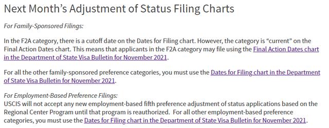由于EB-5区域中心计划目前处于暂停状态,移民局暂停接受EB-5区域中心项目投资人的I-485申请。对于其他类别职业移民申请人来说,在11月份可以使用表B递交I-485。