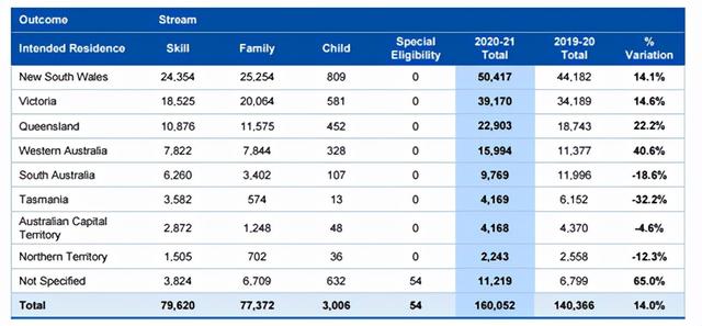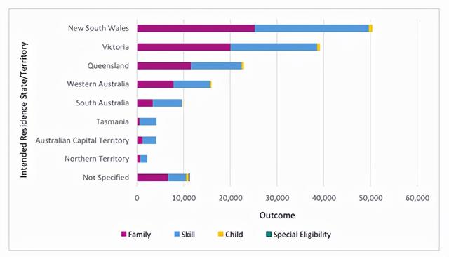 位居榜首的是新南威尔士州,总数50,417人,跟之前一个财年相比(2019-2022财年),技术移民、家庭团聚和子女类移民总数增加了14.1%。