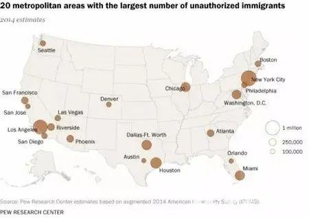 现在的墨西哥移民美国,主要也是这种路线,先偷摸进入美国,然后躲在后厨等大赦或者攒钱搞身份。据估计,现在美国黑着1100万这种黑户等大赦,拜登考虑过一个特赦八百万人的政策,不过没操作下去,下图是非法移民的地图: