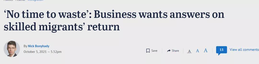 其实这也不是澳洲行业内第一次呼吁增加技术移民了。不久前代表约 60,000 家企业的澳大利亚工业集团(Australian Industry Group)的CEO Innes Willox表示,一旦各州和领地解除封锁,技能短缺将迅速加剧,澳洲需要尽快恢复到大流行前的技术移民水平。“我们的国际边界需要尽快重新开放,没有时间可以浪费了。”