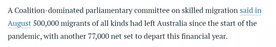 8月份一项数据还显示,自疫情爆发以来,已有 500,000 名各类移民离开澳大利亚,本财年还将有 77,000 人净离开。
