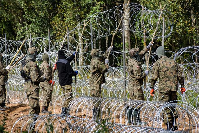 波兰士兵正在边境架设铁丝网。图源:视觉中国