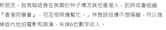 林雅诗为此推掉了很多内地拍电影与商演的工作机会,预计损失6位数的收入。