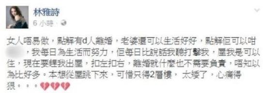 林雅诗宣布离婚后在社交平台上发文说自己天天被打击被羞辱,还被赶出家门。她一度悲伤到想跳楼寻死,想法非常偏激。
