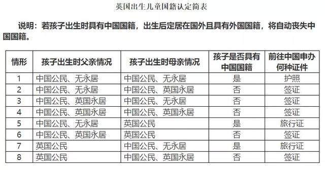 根据中国驻英大使馆公布的“关于国籍认定和有关问题的说明”,中国公民在英国所生儿童国籍认定如下: